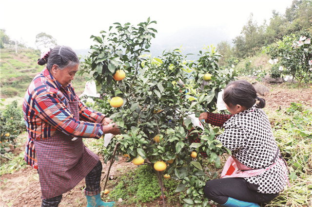 重庆彭水网(融媒体记者 杨春燕 摄影)近年来,高谷镇庞溪村合理利用资源,积极流转土地,凭借良好的地理位置与气候条件,大力发展特色产业,带动群众增收致富。图为10月19日,庞溪村十余名村民正在种植基地给即将成熟的爱媛套袋。