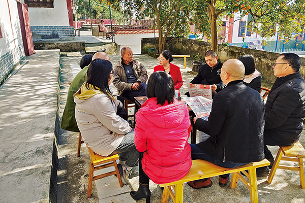 11月30日,在郁山镇白池村,县纪委监委宣传部干部职工和部分村民以院坝会形式共同学习党的十九届六中全会精神,将全会精神引向深入。 通讯员 施远琳 摄影