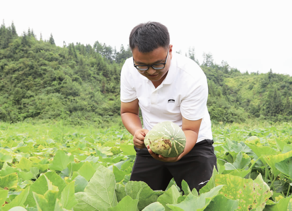 乔梓乡水花村2组邱俊行正在查看南瓜生长情况