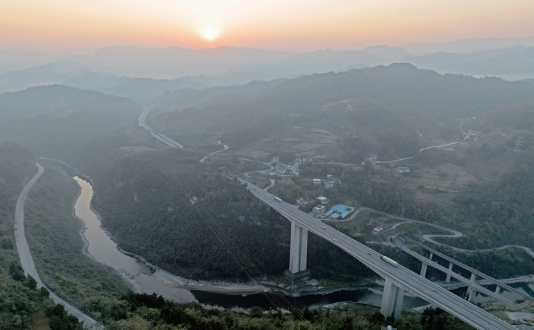 重庆彭水网(记者 赵勇)12月24日,在保家镇境内,渝怀铁路、包茂高速公路、G319国道与其它乡村公路纵横交错,在夕阳的映衬下显得尤为壮观,构筑起了一幅“天堑变通途”的山乡美丽画卷。
