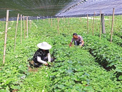 目前,龙射镇采取“企业+农户”的模式发展山葵产业,在葡萄村打造山葵种植基地,由企业负责提供种苗、肥料等支持并包回收,农户负责种植和采收。企业全程提供技术指导,并且,葡萄村村支“两委”党员干部,主动作为帮助联系种植户,农户只需专心搞好山葵种植,不需要操心其他事情,种植出来就有收获。