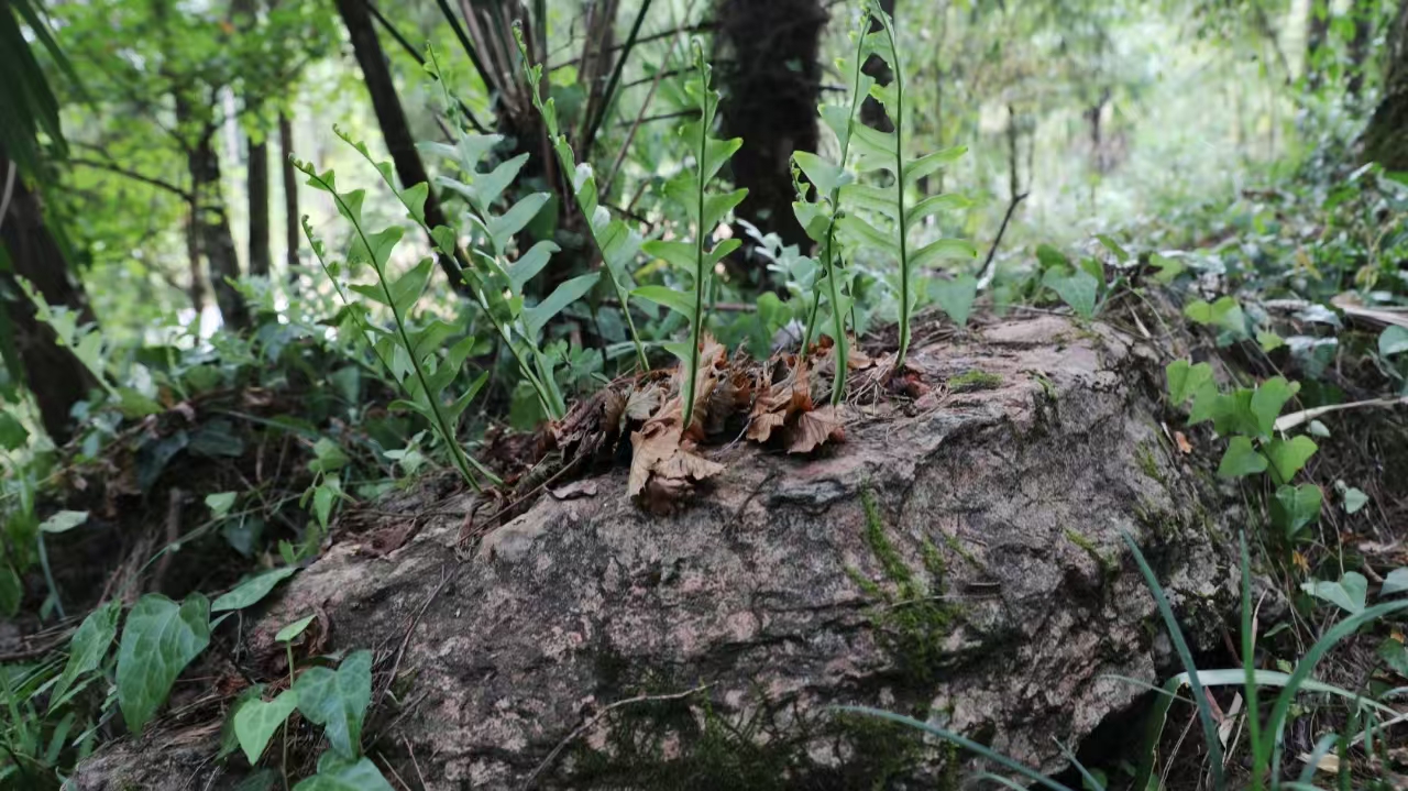 在漆树村的一片树林里,只见林间的石头上长着一株株绿色像蕨类的植物,这就是漆树村中药材骨碎补种植试验基地。